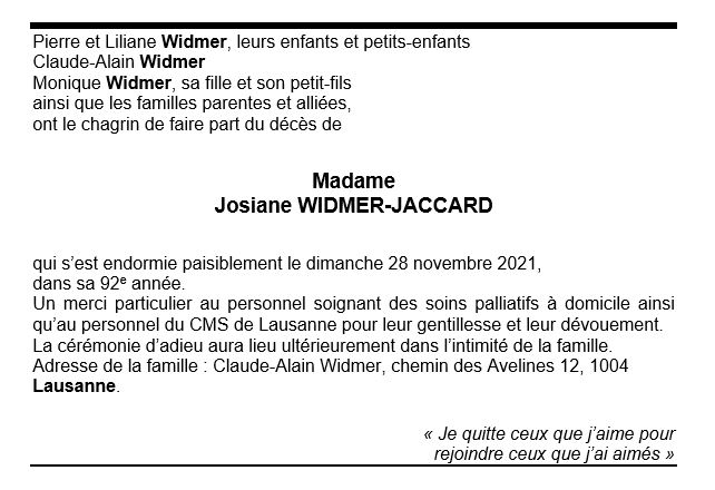 Madame Josiane WIDMER-JACCARD 03 mar. 1930 - 28 nov. 2021 Avis mortuaire PFG Télecharger PDF Partager sur: Galerie PreviousNext PreviousNext