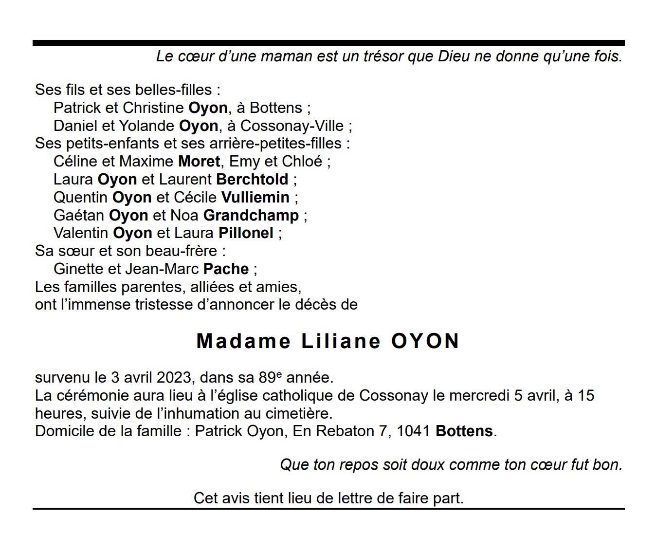 Madame Liliane OYON 24 déc. 1934 - 03 avr. 2023 Avis mortuaire PFG Télecharger PDF Partager sur: Galerie PreviousNext PreviousNext