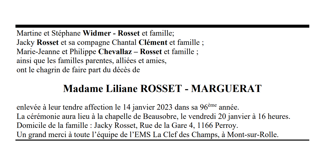 Madame Liliane ROSSET - MARGUERAT 20 avr. 1927 - 14 jan. 2023 Avis mortuaire PFG Télecharger PDF Partager sur: Galerie PreviousNext PreviousNext
