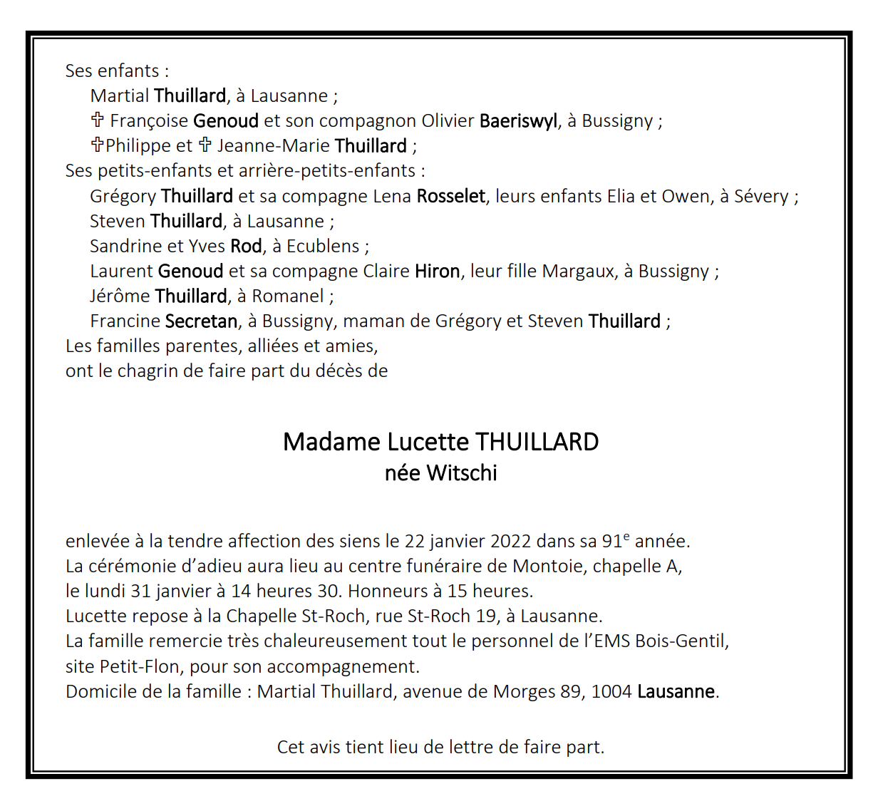 Madame Lucette THUILLARD 21 mai. 1931 - 22 jan. 2022 Avis mortuaire PFG Télecharger PDF Partager sur: Galerie PreviousNext PreviousNext