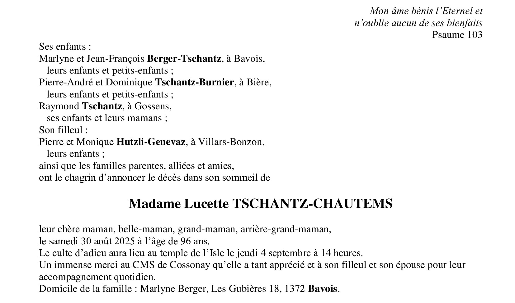 Madame Lucette TSCHANTZ-CHAUTEMS 23 jan. 1929 - 30 aoû. 2025 Avis mortuaire PFG Partager sur: Galerie