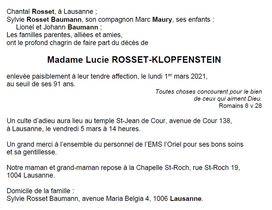 Madame Lucie ROSSET-KLOPFENSTEIN