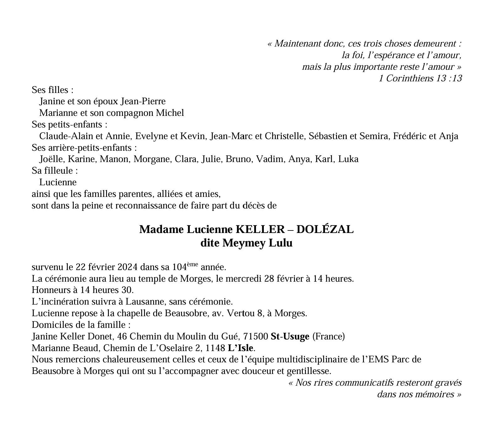 Madame Lucienne KELLER – DOLÉZAL dite Meymey Lulu 24 juin. 1920 - 22 fév. 2024 Avis mortuaire PFG Télecharger PDF Partager sur: Galerie PreviousNext PreviousNext