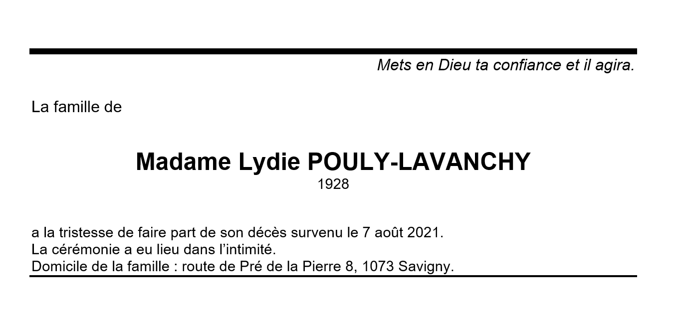 Madame Lydie POULY-LAVANCHY 13 jan. 1928 - 07 aoû. 2021 Avis mortuaire PFG Télecharger PDF Partager sur: Galerie PreviousNext PreviousNext