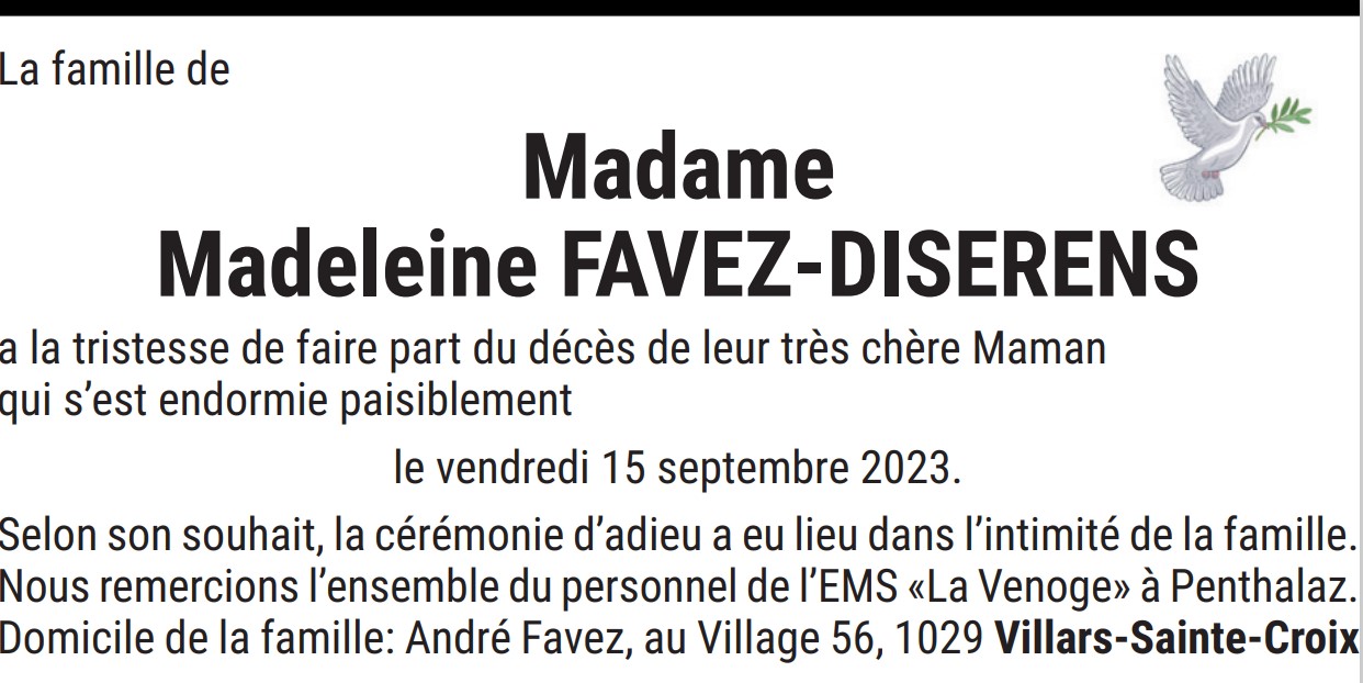 Madame Madeleine FAVEZ-DISERENS 21 nov. 1927 - 15 sep. 2023 Avis mortuaire PFG Télecharger PDF Partager sur: Galerie PreviousNext PreviousNext