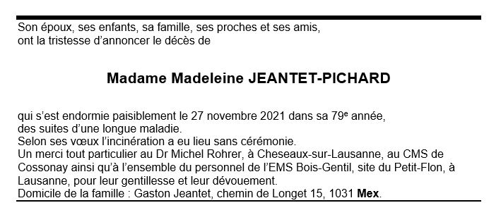 Madame Madeleine JEANTET-PICHARD