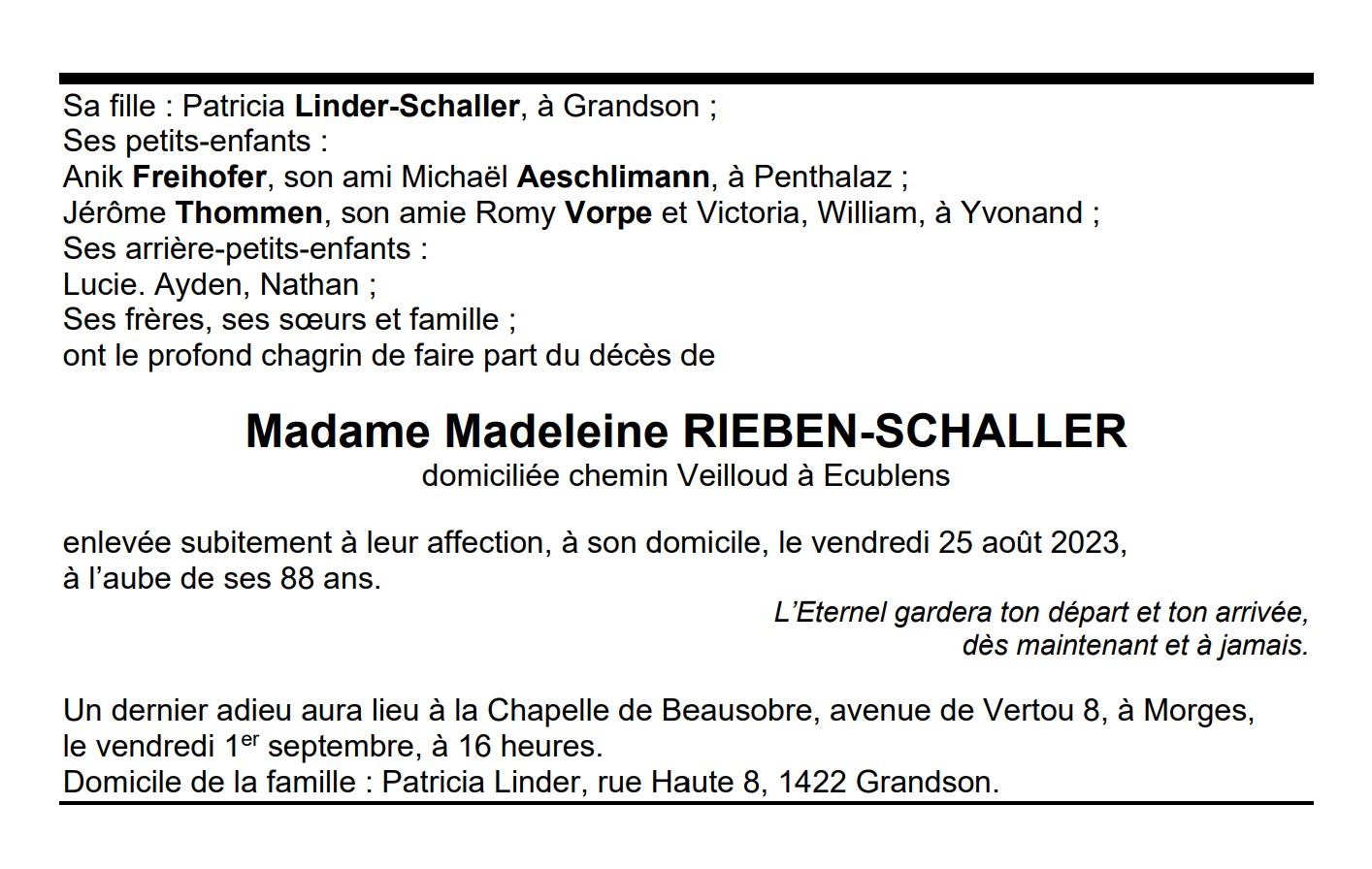 Madame Madeleine RIEBEN-SCHALLER 24 nov. 1935 - 25 aoû. 2023 Avis mortuaire PFG Télecharger PDF Partager sur: Galerie PreviousNext PreviousNext