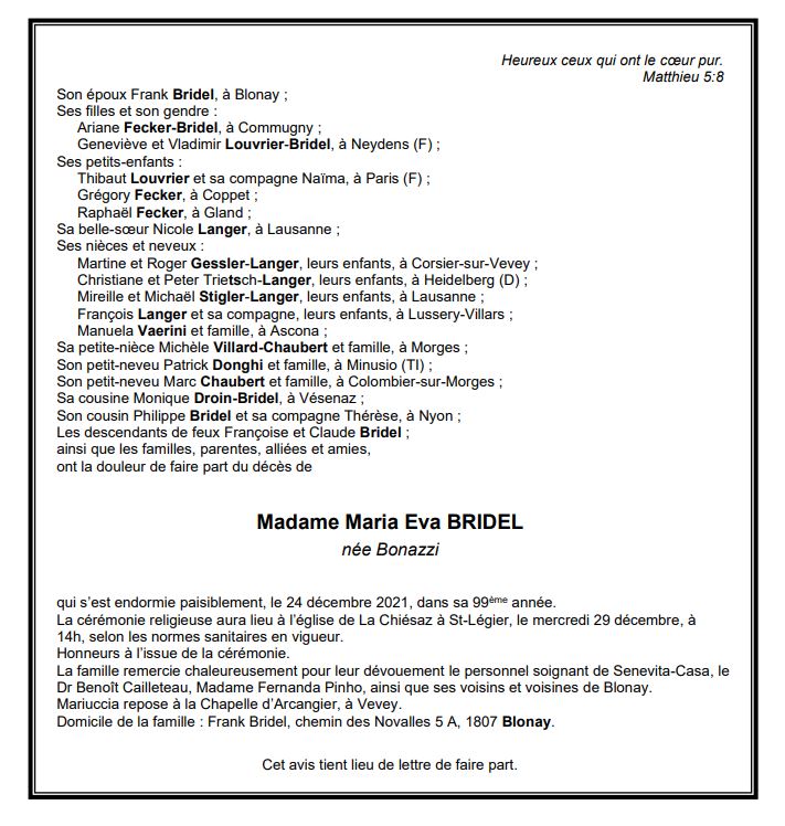 Madame Maria Eva BRIDEL 19 juil. 1923 - 24 déc. 2021 Avis mortuaire PFG Télecharger PDF Partager sur: Galerie PreviousNext PreviousNext