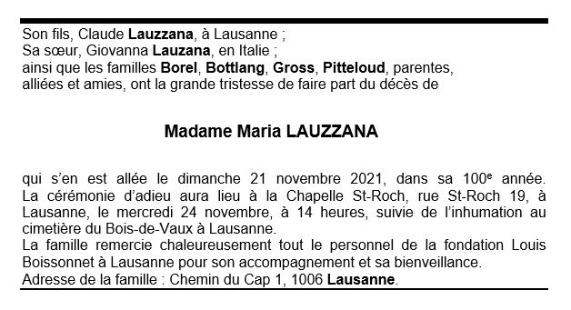 Madame Maria LAUZZANA 03 sep. 1922 - 21 nov. 2021 Avis mortuaire PFG Télecharger PDF Partager sur: Galerie PreviousNext PreviousNext