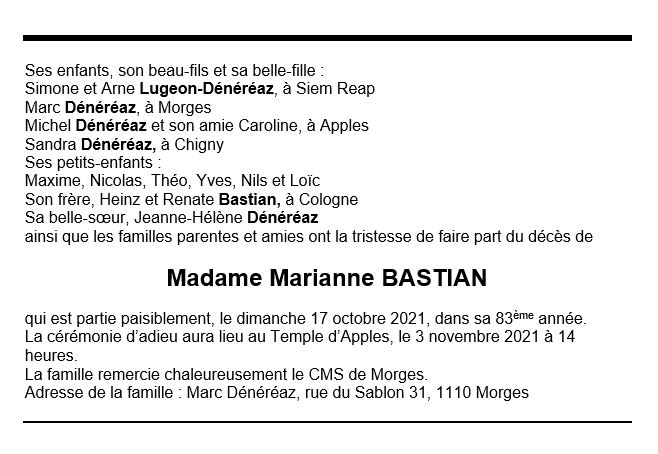Madame Marianne BASTIAN 12 jan. 1938 - 17 oct. 2021 Avis mortuaire PFG Télecharger PDF Partager sur: Galerie PreviousNext PreviousNext