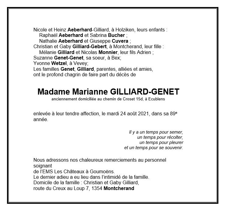 Madame Marianne GILLIARD-GENET 12 mar. 1933 - 24 aoû. 2021 Avis mortuaire PFG Télecharger PDF Partager sur: Galerie PreviousNext PreviousNext