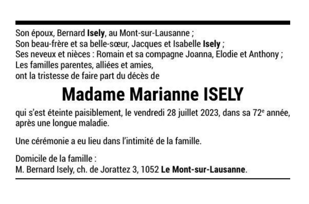 Madame Marianne ISELY 19 sep. 1951 - 28 juil. 2023 Avis mortuaire PFG Télecharger PDF Partager sur: Galerie PreviousNext PreviousNext