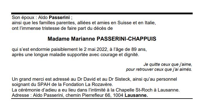 Madame Marianne PASSERINI-CHAPPUIS 04 mar. 1933 - 02 mai. 2022 Avis mortuaire PFG Télecharger PDF Partager sur: Galerie PreviousNext PreviousNext