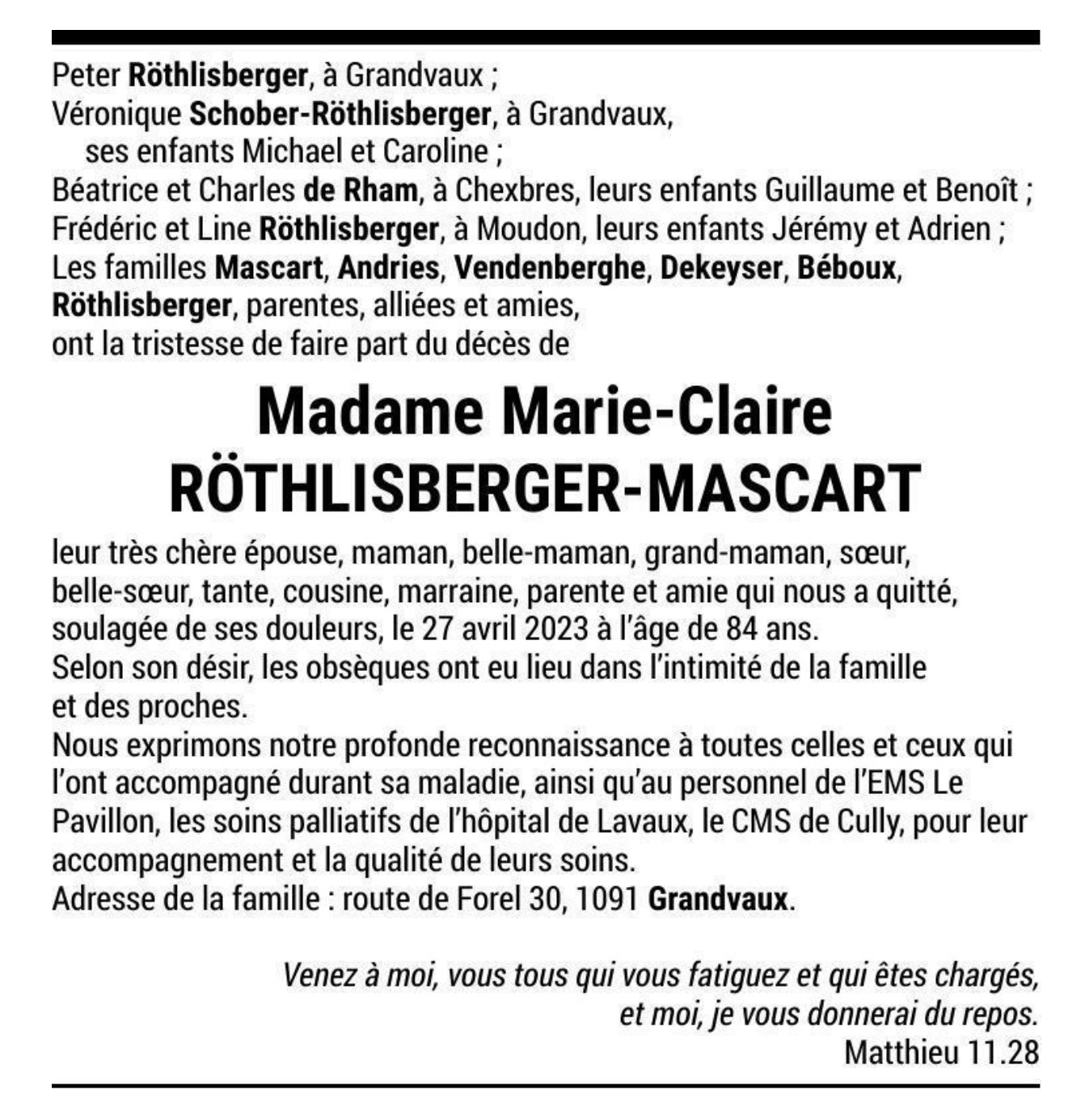 Madame Marie-Claire RÖTHLISBERGER-MASCART 19 fév. 1939 - 27 avr. 2023 Avis mortuaire PFG Télecharger PDF Partager sur: Galerie PreviousNext PreviousNext