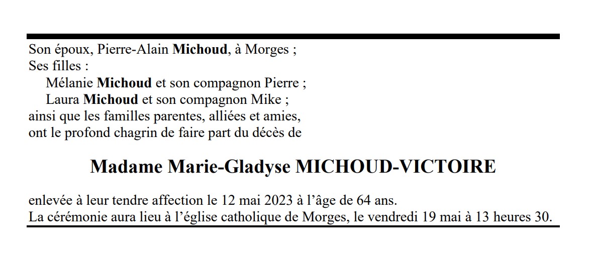 Madame Marie-Gladyse MICHOUD-VICTOIRE 12 mai. 1959 - 12 mai. 2023 Avis mortuaire PFG Télecharger PDF Partager sur: Galerie PreviousNext PreviousNext