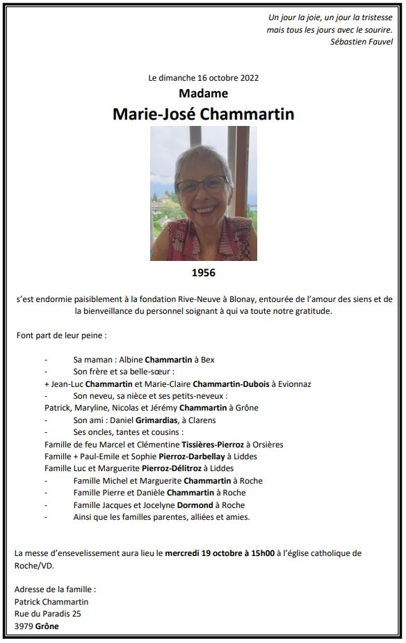 Madame Marie-José Chammartin 25 aoû. 1956 - 16 oct. 2022 Avis mortuaire PFG Télecharger PDF Partager sur: Galerie PreviousNext PreviousNext