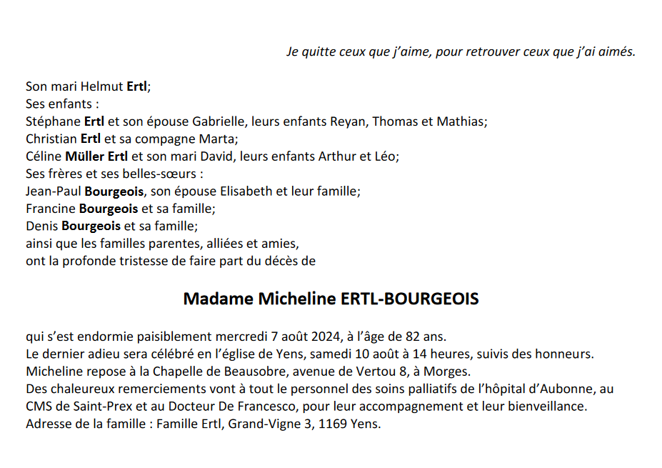 Madame Micheline ERTL-BOURGEOIS 19 juil. 1942 - 07 aoû. 2024 Avis mortuaire PFG Télecharger PDF Partager sur: Galerie