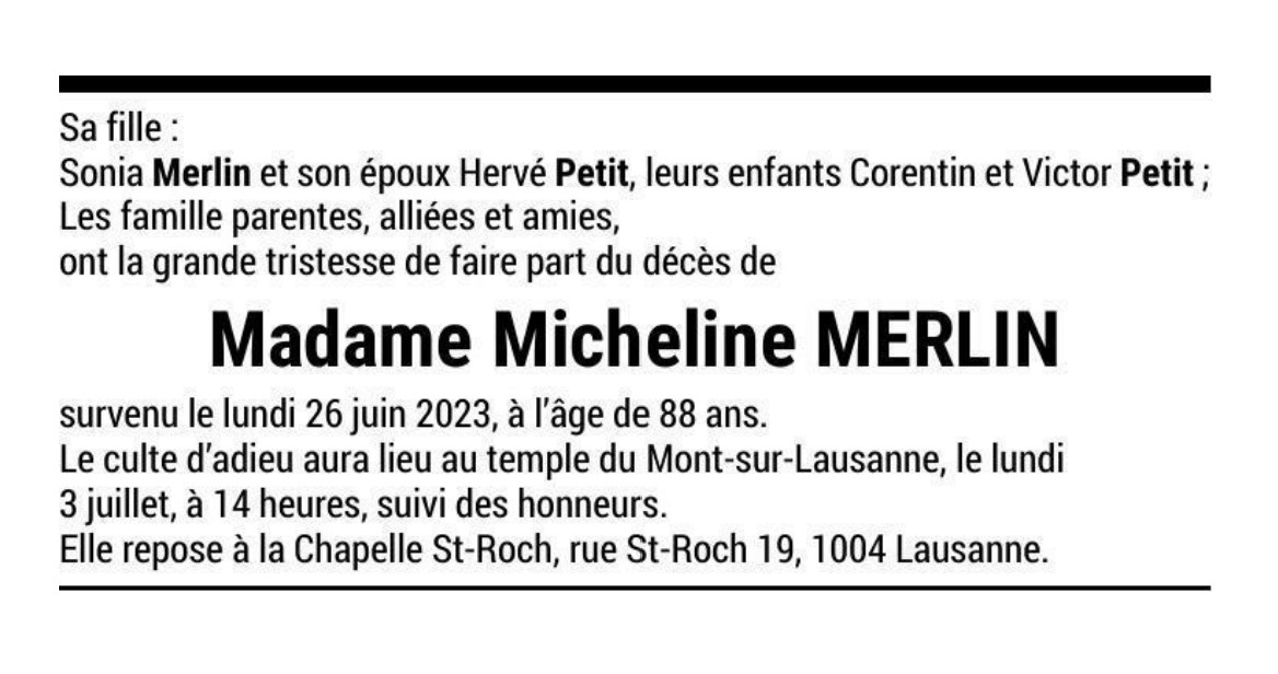 Madame Micheline MERLIN 01 mar. 1935 - 26 juin. 2023 Avis mortuaire PFG Télecharger PDF Partager sur: Galerie PreviousNext PreviousNext