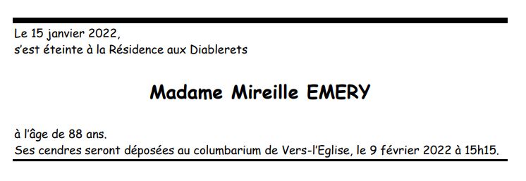 Madame Mireille EMERY 11 mai. 1933 - 15 jan. 2022 Avis mortuaire PFG Télecharger PDF Partager sur: Galerie PreviousNext PreviousNext