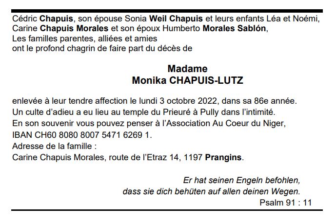 Madame Monika CHAPUIS-LUTZ 21 jan. 1937 - 03 oct. 2022 Avis mortuaire PFG Télecharger PDF Partager sur: Galerie PreviousNext PreviousNext