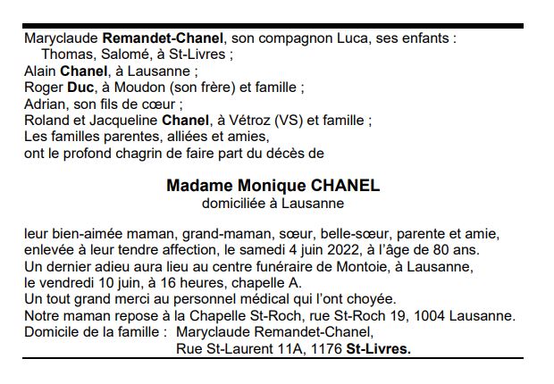Madame Monique CHANEL 24 nov. 1941 - 04 juin. 2022 Avis mortuaire PFG Télecharger PDF Partager sur: Galerie PreviousNext PreviousNext