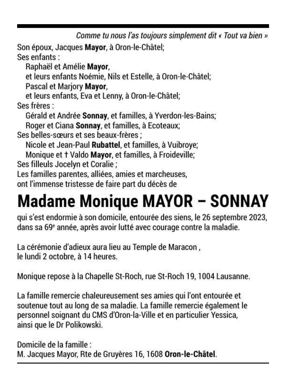 Madame Monique MAYOR - SONNAY 12 déc. 1954 - 26 sep. 2023 Avis mortuaire PFG Télecharger PDF Partager sur: Galerie PreviousNext PreviousNext