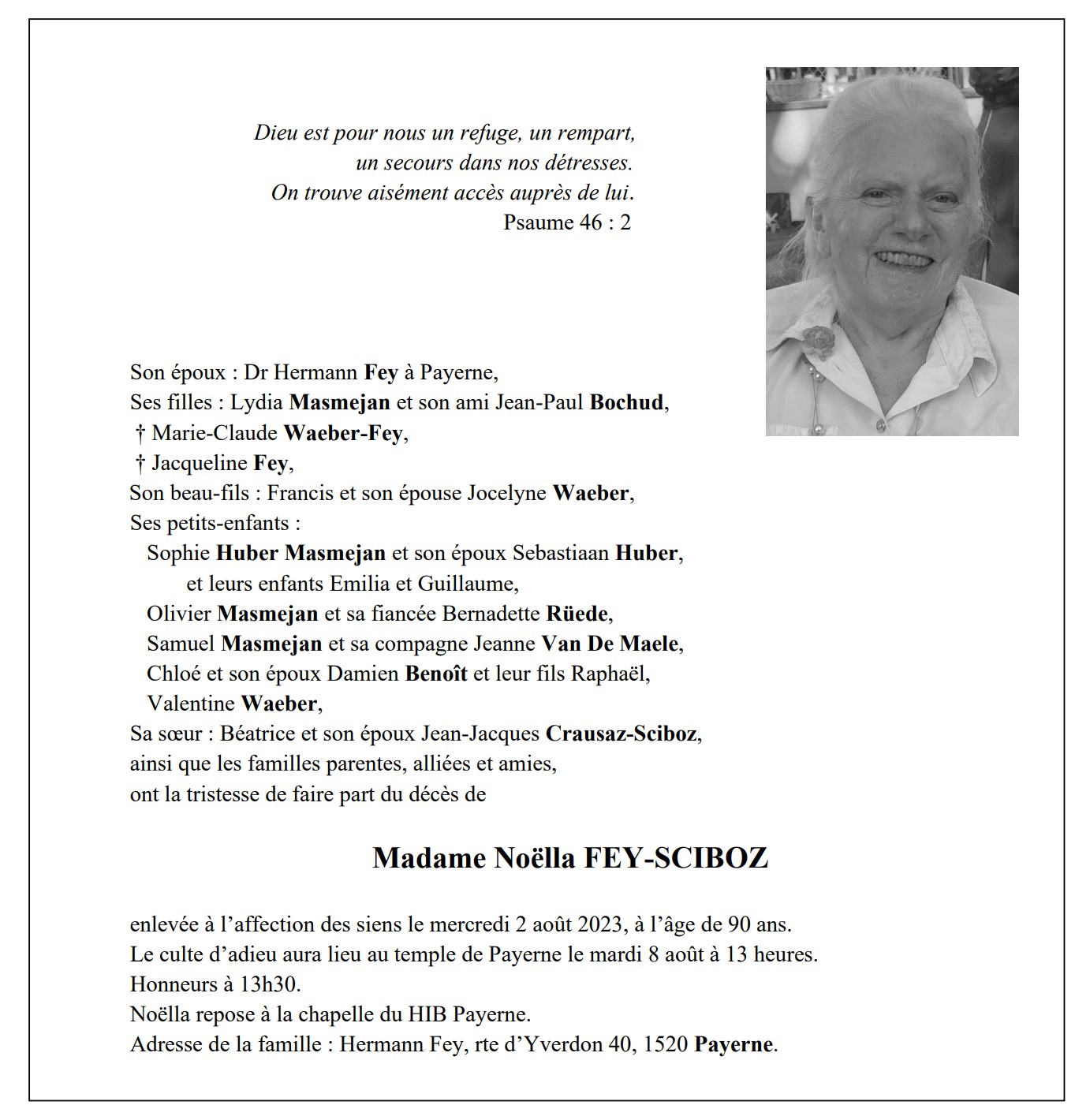 Madame Noëlla FEY-SCIBOZ 25 déc. 1932 - 02 aoû. 2023 Avis mortuaire PFG Télecharger PDF Partager sur: Galerie PreviousNext PreviousNext