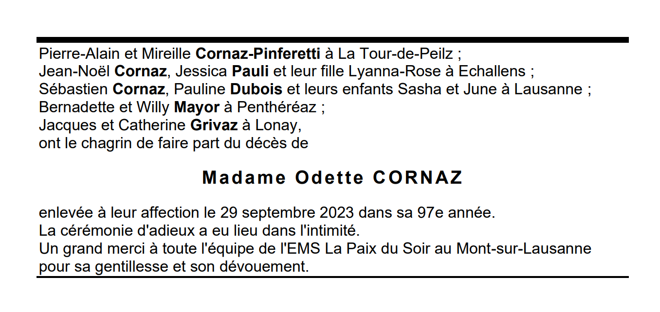 Madame Odette CORNAZ 09 oct. 1926 - 29 sep. 2023 Avis mortuaire PFG Télecharger PDF Partager sur: Galerie PreviousNext PreviousNext