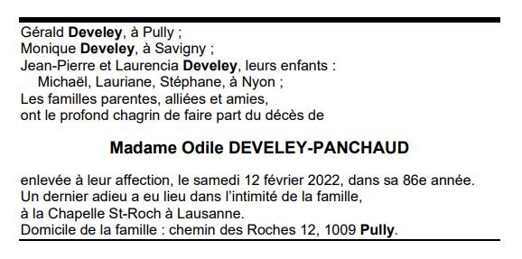 Madame Odile DEVELEY-PANCHAUD 18 nov. 1936 - 12 fév. 2022 Avis mortuaire PFG Télecharger PDF Partager sur: Galerie PreviousNext PreviousNext