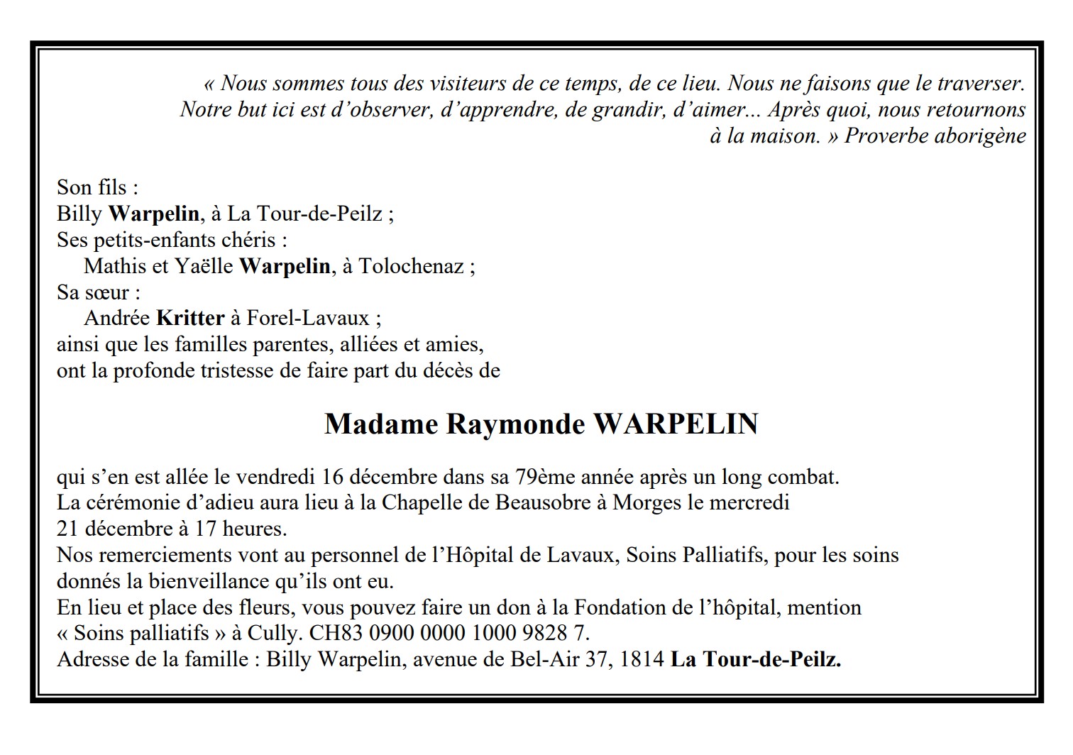 Madame Raymonde WARPELIN 22 mar. 1944 - 16 déc. 2022 Avis mortuaire PFG Télecharger PDF Partager sur: Galerie PreviousNext PreviousNext