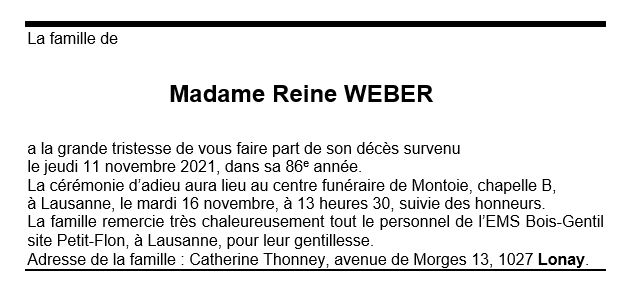 Madame Reine WEBER 06 jan. 1936 - 11 nov. 2021 Avis mortuaire PFG Télecharger PDF Partager sur: Galerie PreviousNext PreviousNext
