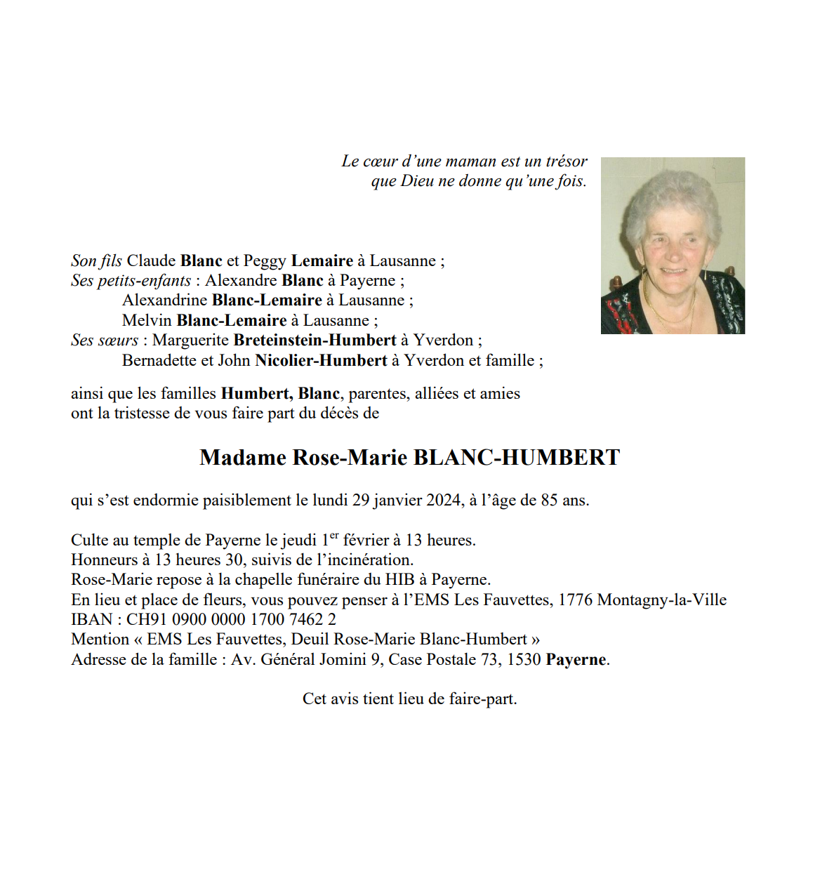 Madame Rose-Marie BLANC-HUMBERT 07 avr. 1938 - 29 jan. 2024 Avis mortuaire PFG Télecharger PDF Partager sur: Galerie PreviousNext PreviousNext