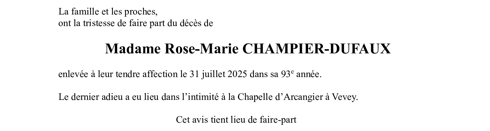 Madame Rose-Marie CHAMPIER-DUFAUX 02 déc. 1932 - 31 juil. 2025 Avis mortuaire PFG Partager sur: Galerie