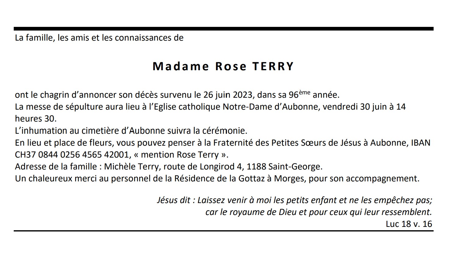 Madame Rose TERRY 10 déc. 1927 - 26 juin. 2023 Avis mortuaire PFG Télecharger PDF Partager sur: Galerie PreviousNext PreviousNext