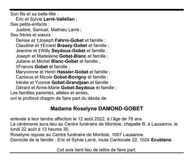 Madame Roselyne DAMOND-GOBET 25 juin. 1946 - 12 aoû. 2022 Avis mortuaire PFG Télecharger PDF Partager sur: Galerie PreviousNext PreviousNext