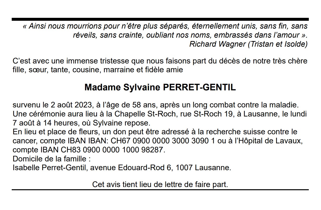 Madame Sylvaine PERRET-GENTIL 21 avr. 1965 - 02 aoû. 2023 Avis mortuaire PFG Télecharger PDF Partager sur: Galerie PreviousNext PreviousNext