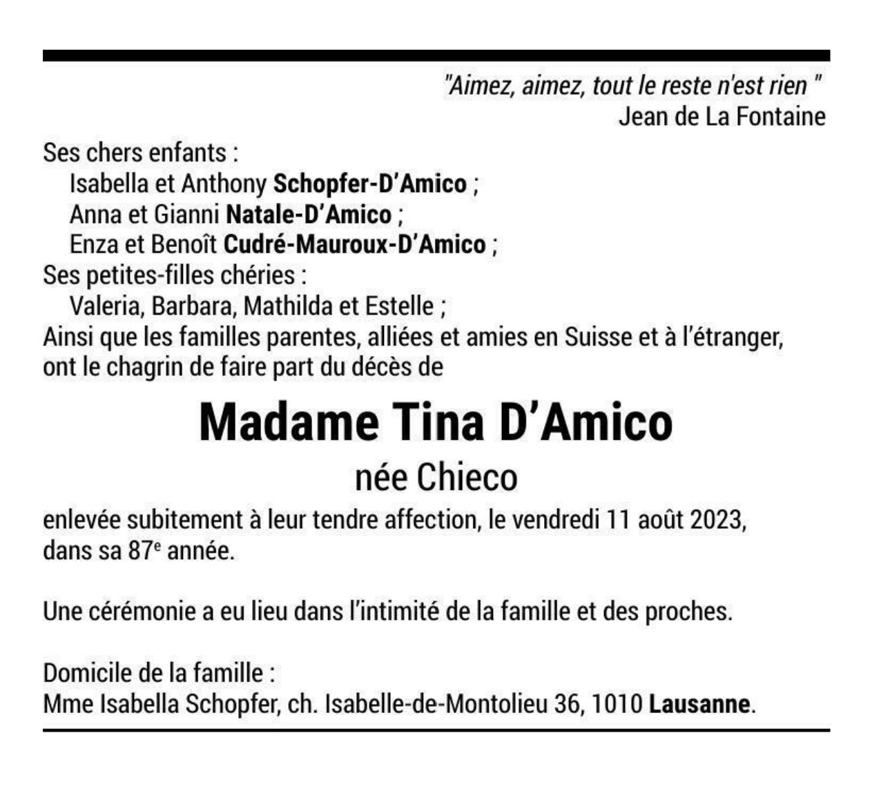 Madame Tina D'Amico née Chieco 21 avr. 1936 - 11 aoû. 2023 Avis mortuaire PFG Télecharger PDF Partager sur: Galerie PreviousNext PreviousNext