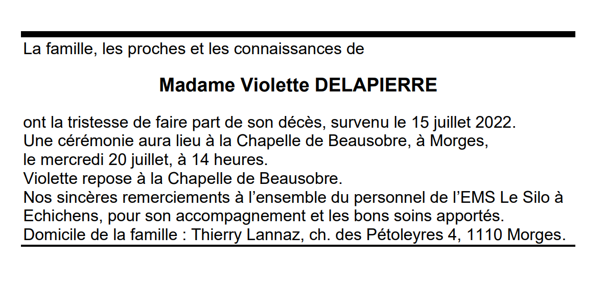 Madame Violette DELAPIERRE 22 aoû. 1935 - 15 juil. 2022 Avis mortuaire PFG Télecharger PDF Partager sur: Galerie PreviousNext PreviousNext