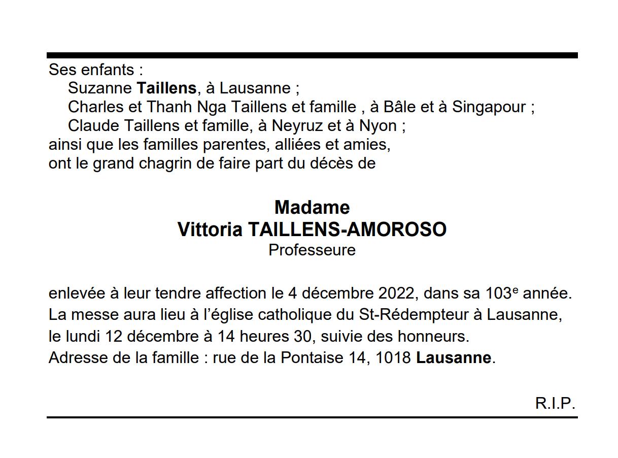 Madame Vittoria TAILLENS-AMOROSO 20 jan. 1920 - 04 déc. 2022 Avis mortuaire PFG Télecharger PDF Partager sur: Galerie PreviousNext PreviousNext