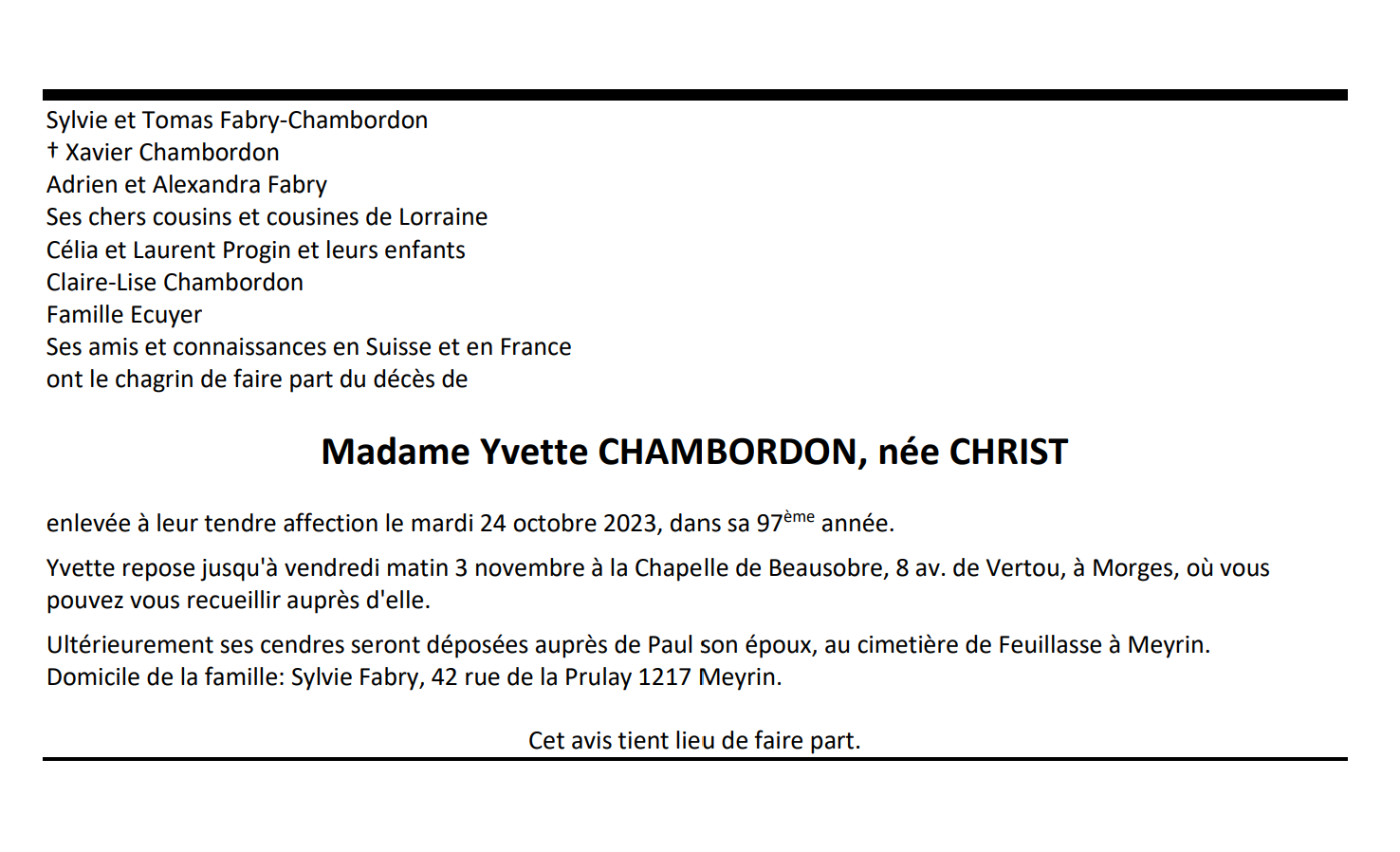 Madame Yvette CHAMBORDON, née CHRIST 11 fév. 1926 - 25 oct. 2023 Avis mortuaire PFG Télecharger PDF Partager sur: Galerie PreviousNext PreviousNext