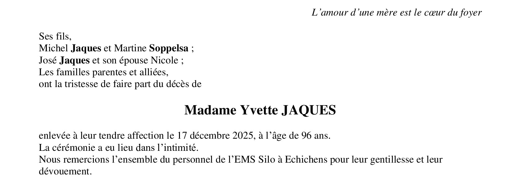 Madame Yvette JAQUES