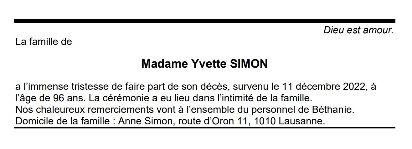 Madame Yvette SIMON 05 déc. 1926 - 11 déc. 2022 Avis mortuaire PFG Télecharger PDF Partager sur: Galerie PreviousNext PreviousNext