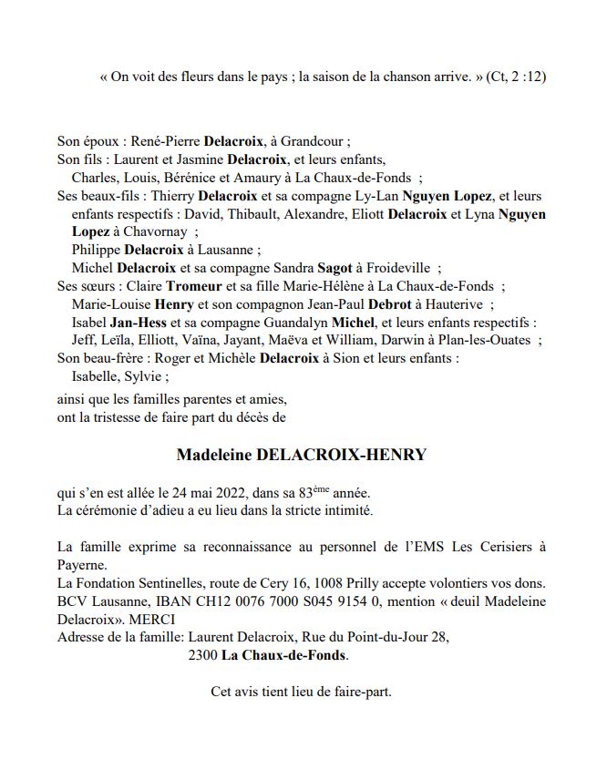 Madeleine DELACROIX-HENRY 07 mai. 1940 - 24 mai. 2022 Avis mortuaire PFG Télecharger PDF Partager sur: Galerie