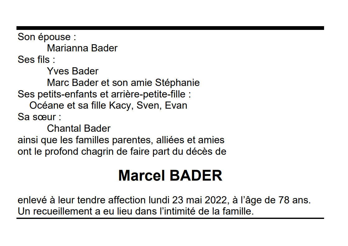 Marcel BADER 22 mai. 1940 - 23 mai. 2022 Avis mortuaire PFG Télecharger PDF Partager sur: Galerie PreviousNext PreviousNext