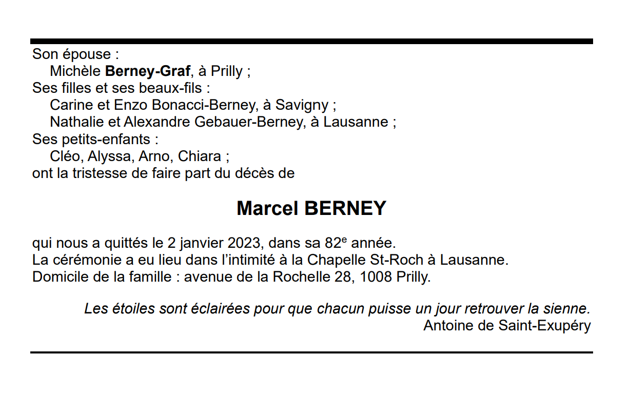 Marcel BERNEY 07 sep. 1941 - 02 jan. 2023 Avis mortuaire PFG Télecharger PDF Partager sur: Galerie PreviousNext PreviousNext