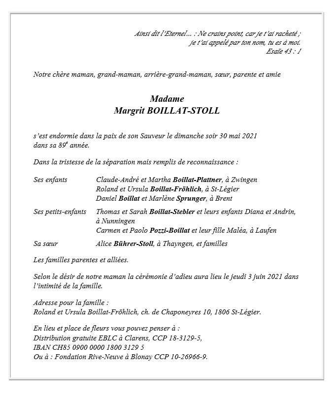Margrit BOILLAT-STOLL 03 mai. 1933 - 30 mai. 2021 Avis mortuaire PFG Télecharger PDF Partager sur: Galerie PreviousNext PreviousNext