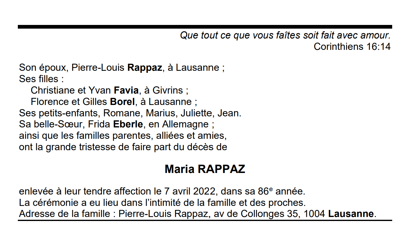 Maria RAPPAZ 31 mai. 1936 - 07 avr. 2022 Avis mortuaire PFG Télecharger PDF Partager sur: Galerie PreviousNext PreviousNext
