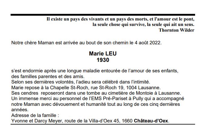 Marie LEU 27 mar. 1930 - 04 aoû. 2022 Avis mortuaire PFG Télecharger PDF Partager sur: Galerie PreviousNext PreviousNext