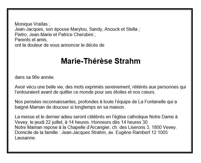Marie-Thérèse STRAHM 18 mar. 1925 - 16 juil. 2021 Avis mortuaire PFG Télecharger PDF Partager sur: Galerie PreviousNext PreviousNext