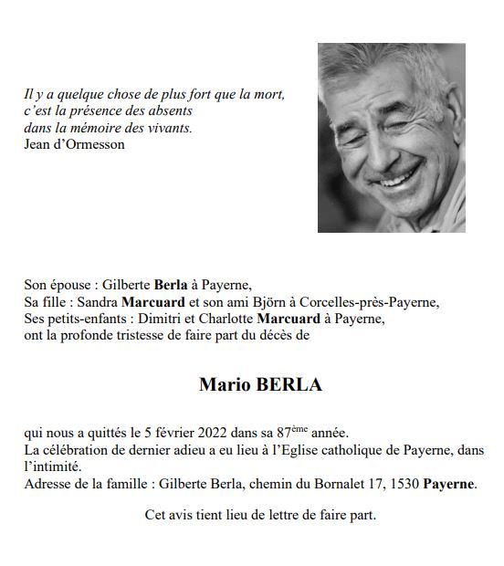Mario BERLA 05 juin. 1935 - 05 fév. 2022 Avis mortuaire PFG Télecharger PDF Partager sur: Galerie PreviousNext PreviousNext